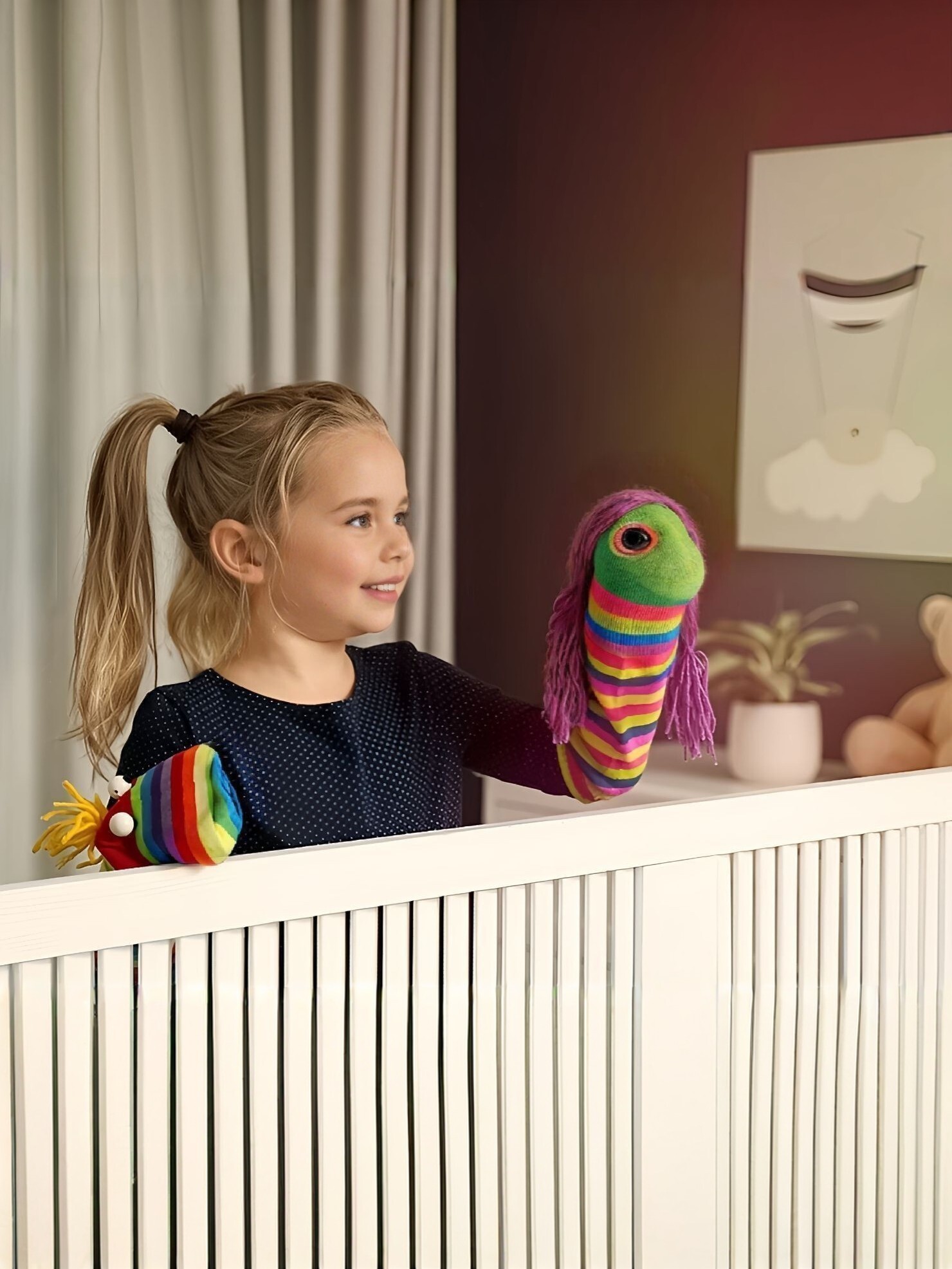 • Наденьте на руку носок, и крибли-крабли-бумс, он превратился на глазах, теперь здесь милый пупс! Украшение носка — бонус дополнительный, для волшебника как вы несколько волнительный. Магию творите вы для малыша, создавая дружбу мягко, не спеша. Вы можете куклу эту внедрить в любую вашу игру, вкусняшками можно её накормить, порезать ей фрукты и торт не забыть на этом шикарном пиру. Вы с куклой можете сказку читать, чтобы увлечь ребёнка или по очереди играть, чтобы смеялся звонко.